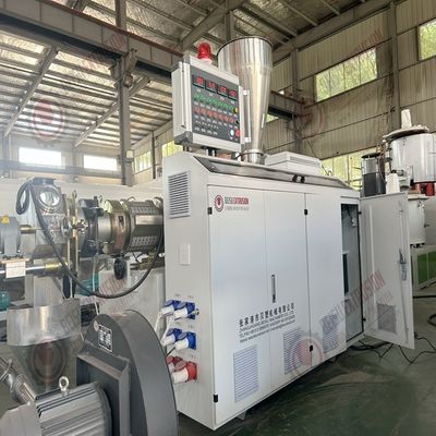 A4 สกรูหมุนต่อเนื่อง และวัสดุที่พลาสติกส์ถูกผลักออกจากเครื่องผลักออกสองสกรูและตัดเป็นลูกกลองโดยเครื่องตัดร้อน